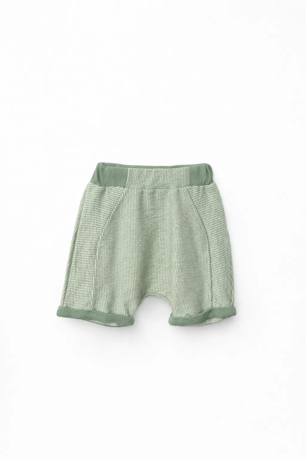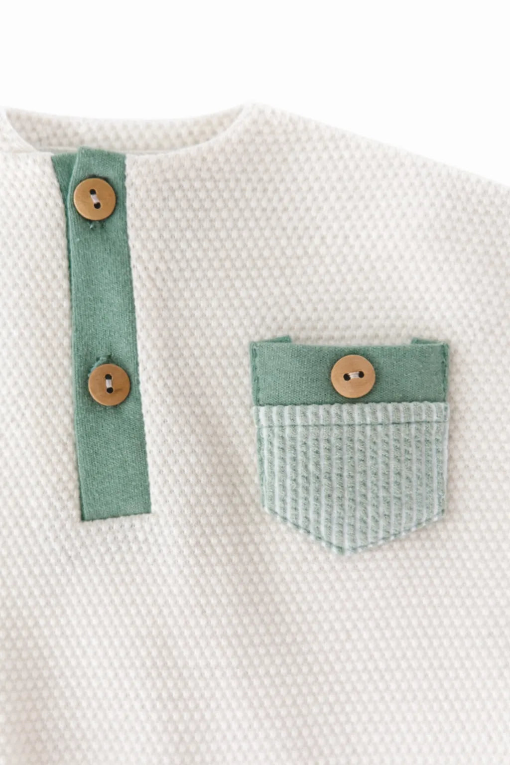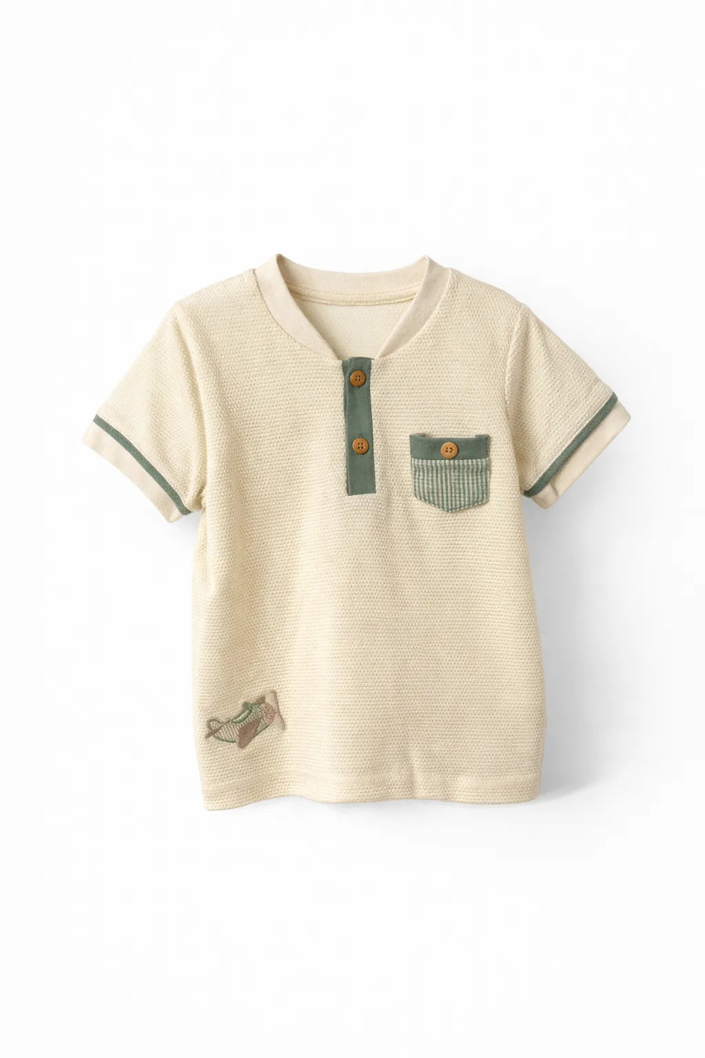 A soft cotton baby boy outfit featuring a short sleeve T-shirt with button detail and matching elastic waist shorts.