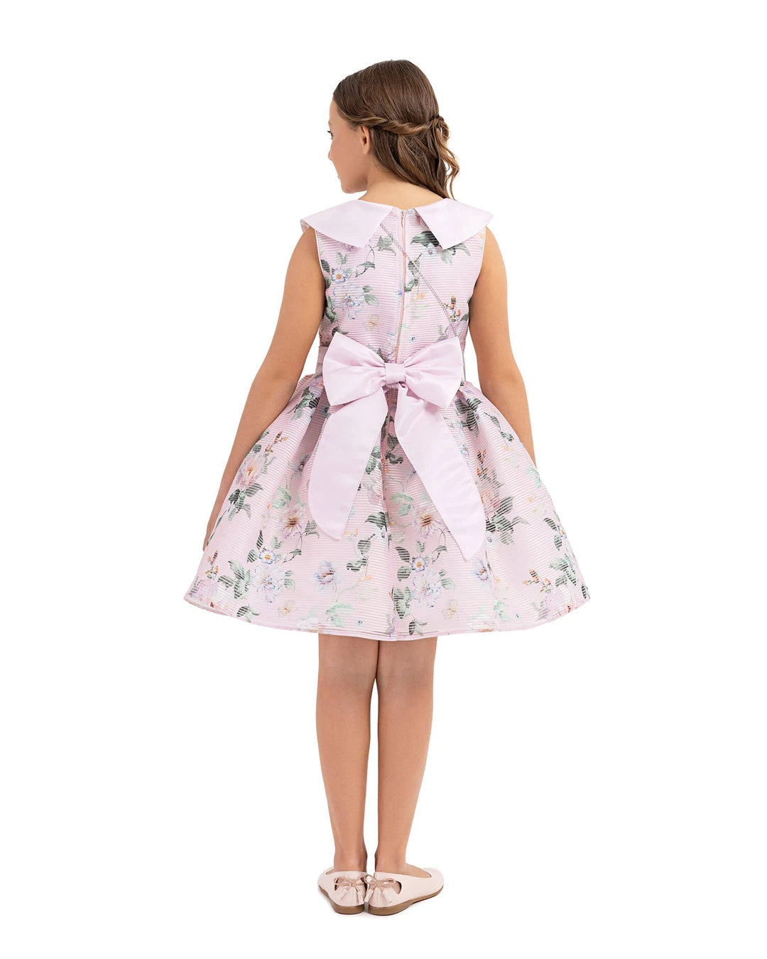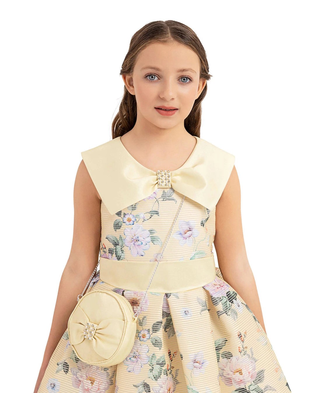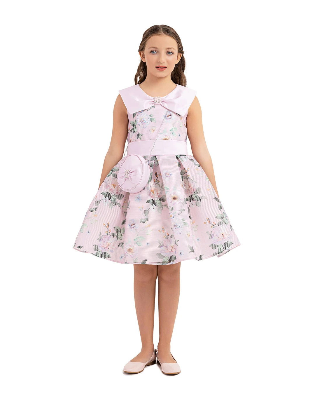 Floral dress with satin collar and jeweled bow a matching bag
