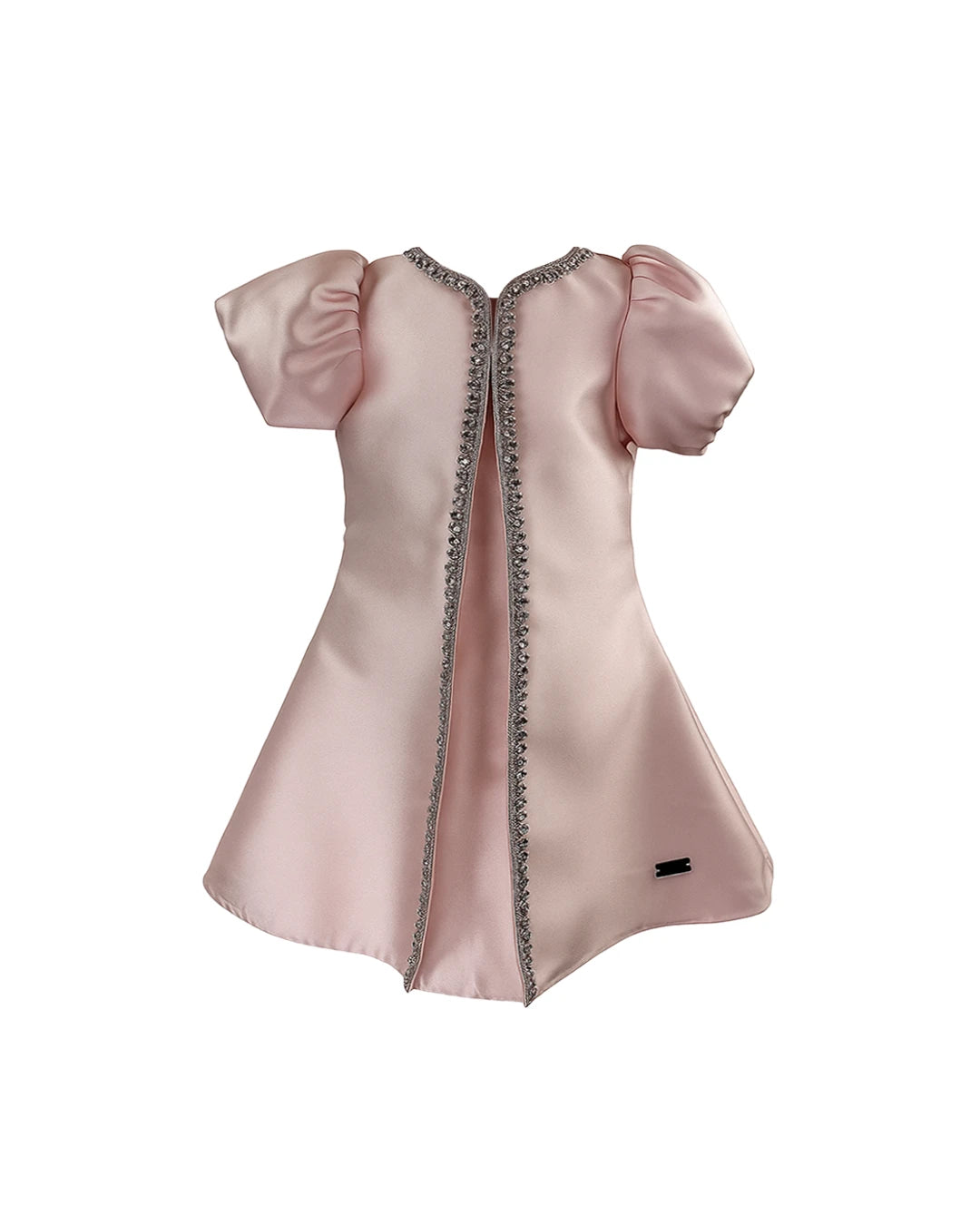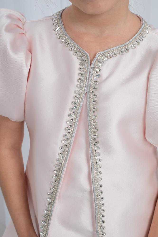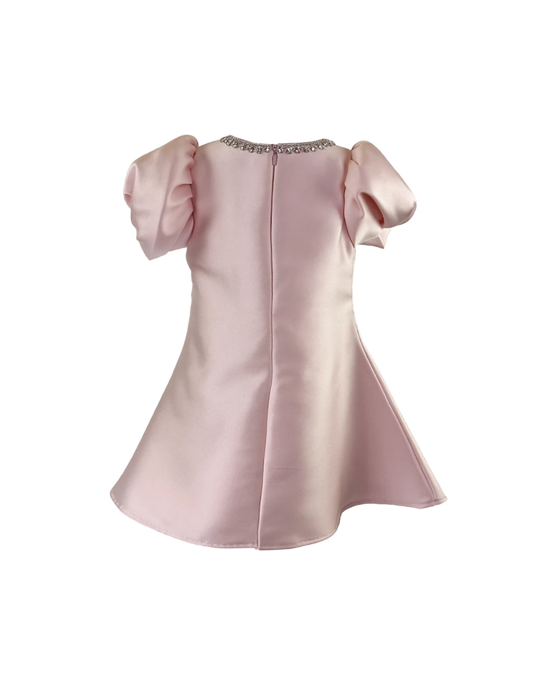 Blush pink dress with puff sleeve and crystal along the front.