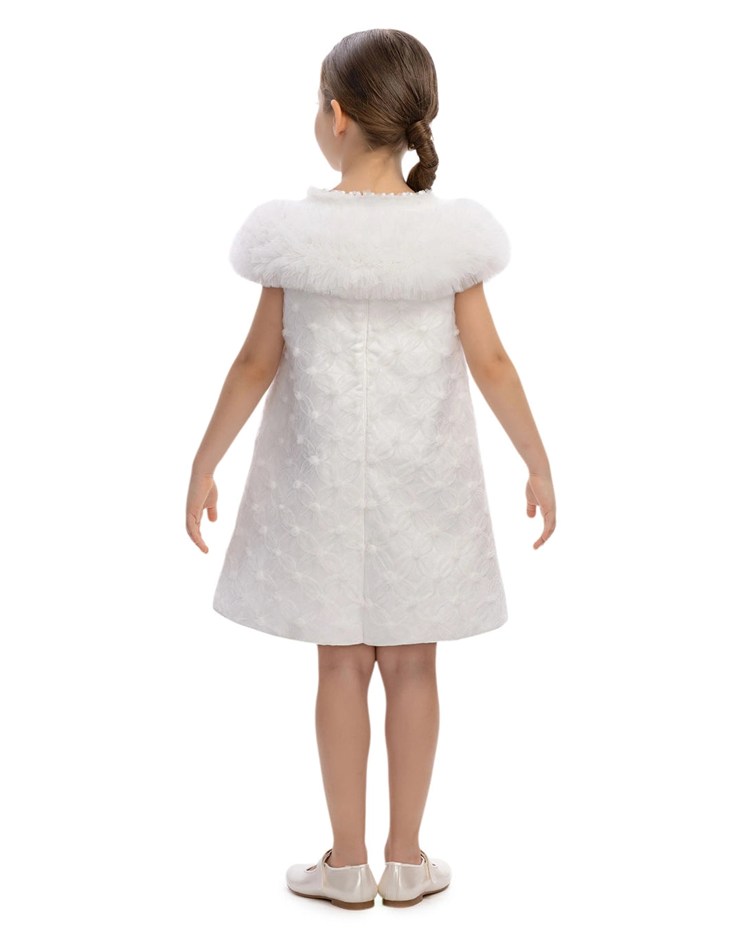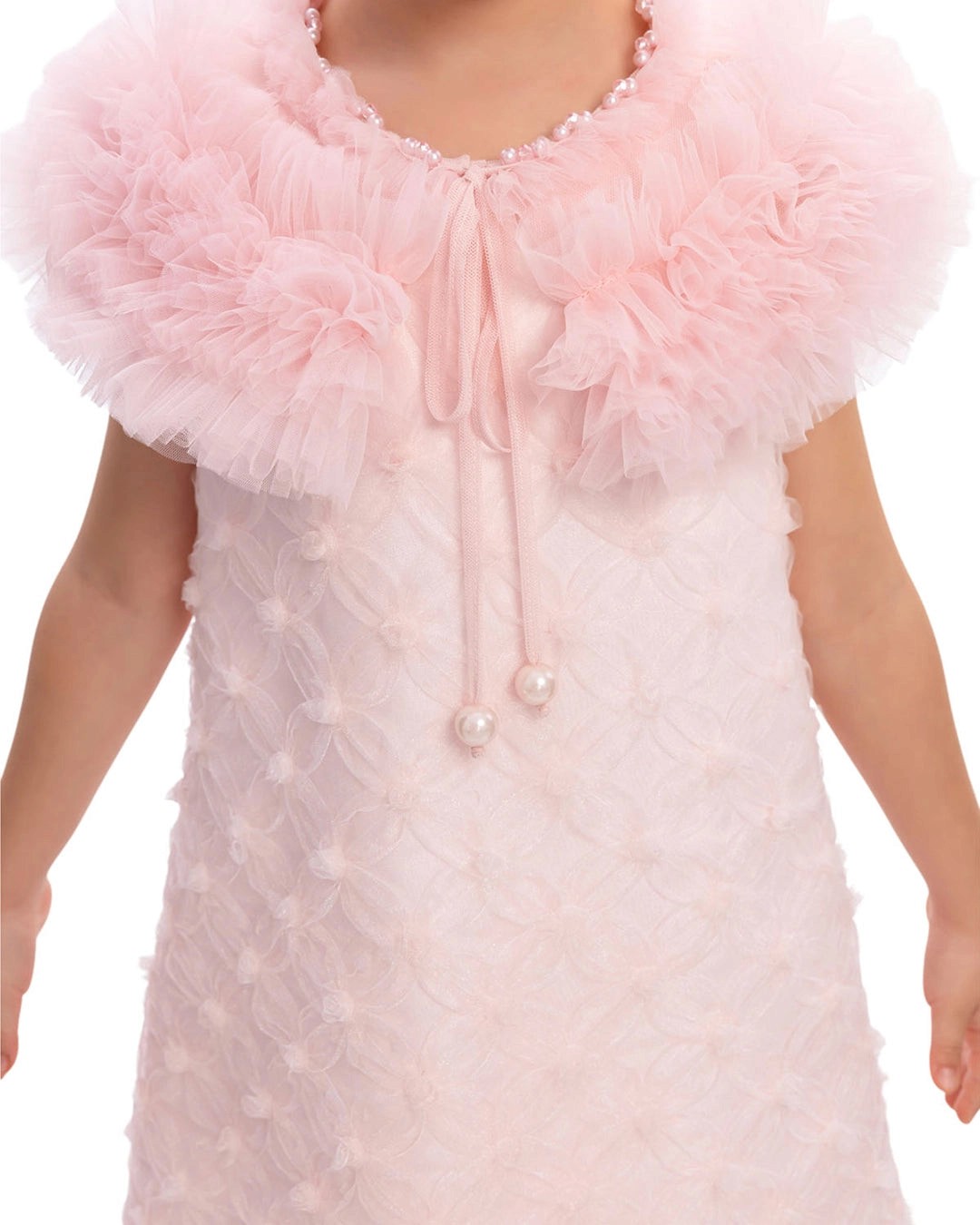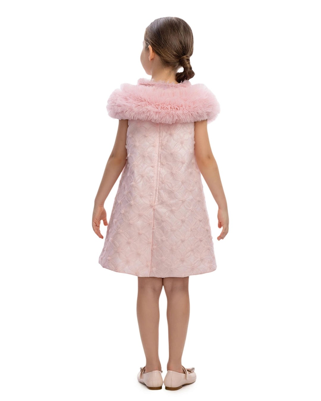 Perfect for celebrations, this pink dress features a fuzzy tulle collar and a sweet, flared, floral-patterned dress.