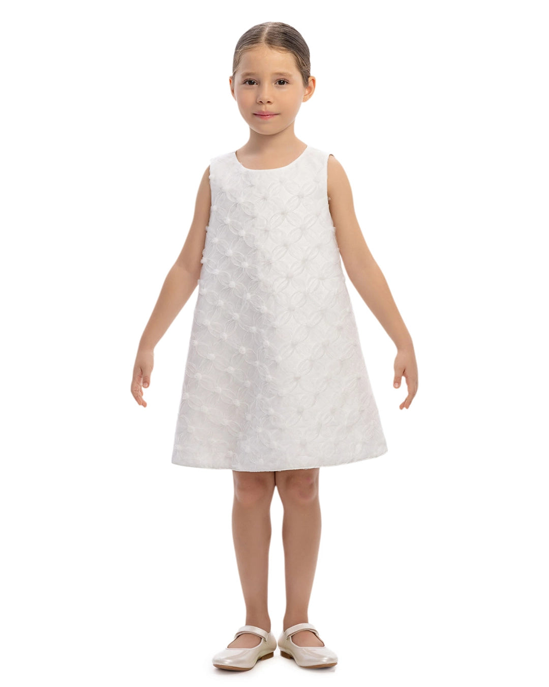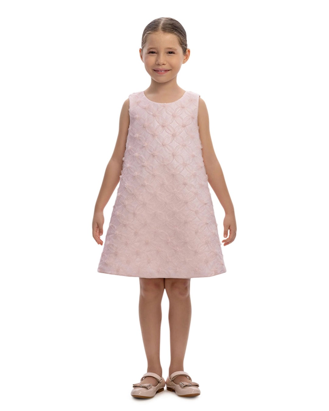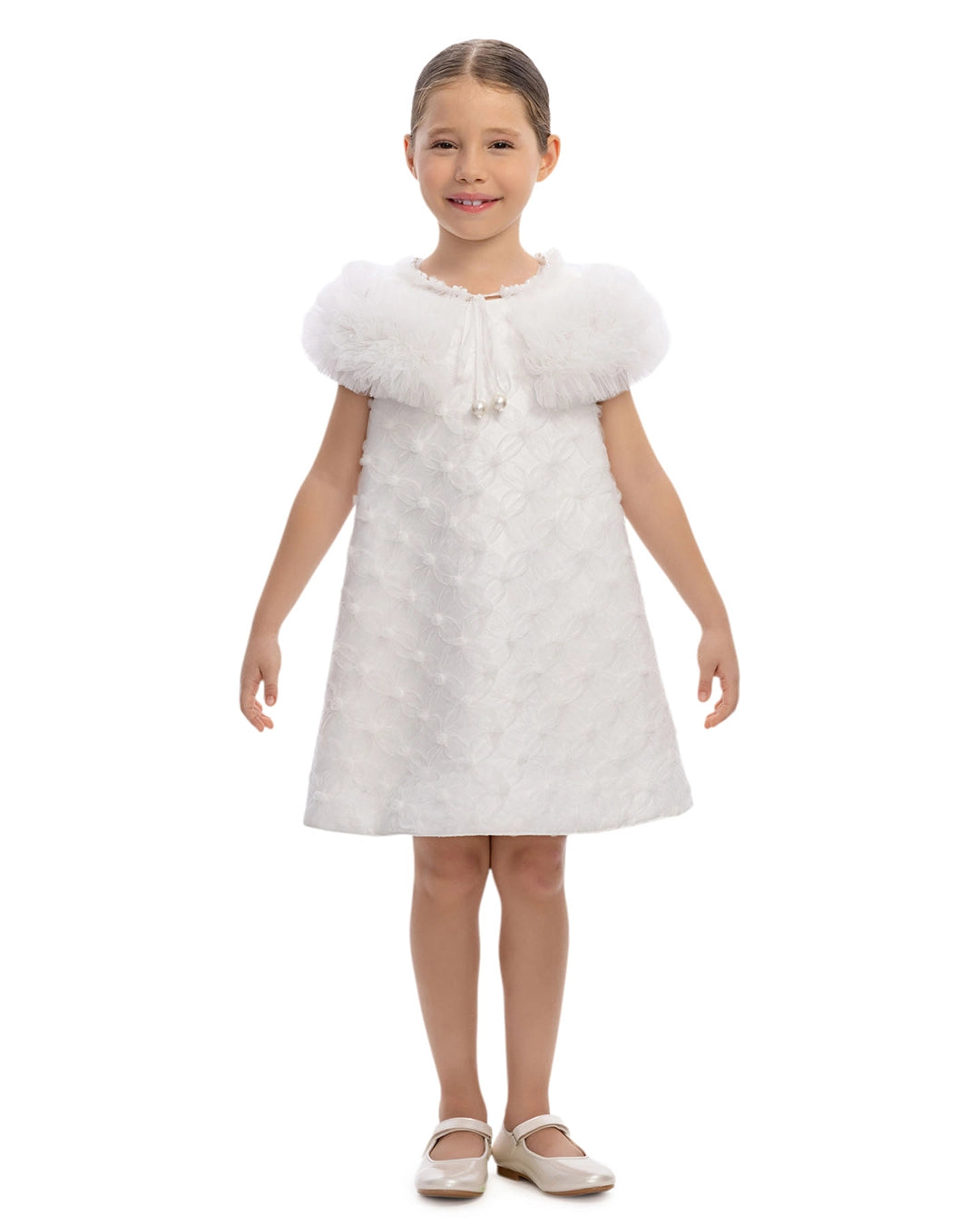 Perfect for celebrations, this pink dress features a fuzzy tulle collar and a sweet, flared, floral-patterned dress.