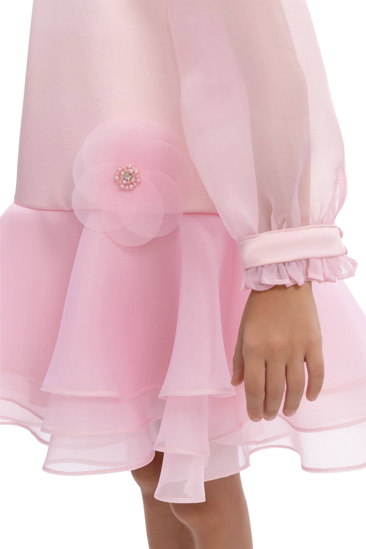 Delicate, dreamy, and oh-so-elegant! This organza-layered dress features a flared skirt with soft cascading ruffles and sheer long sleeves finished with ruffled cuffs for a graceful touch.