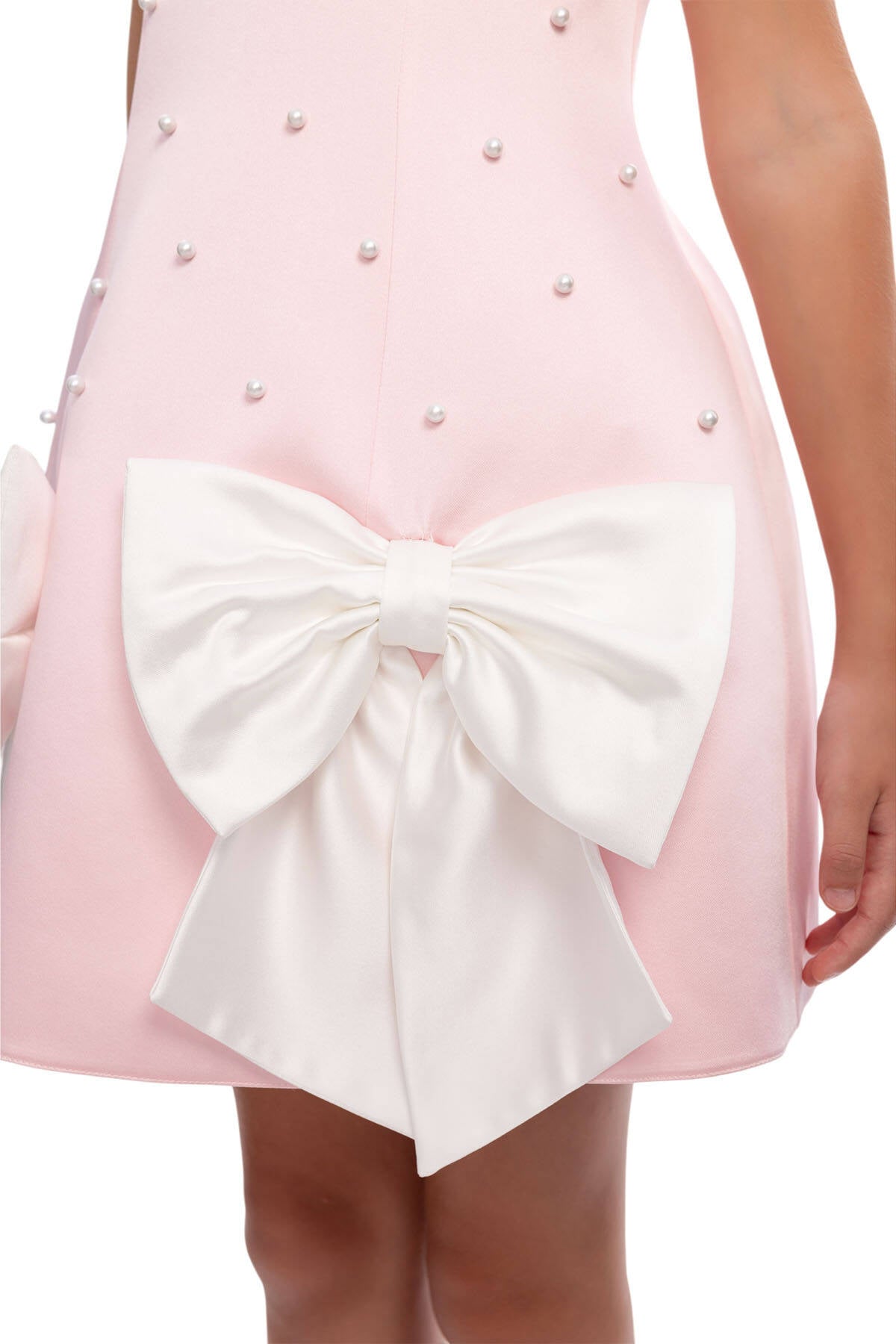 A chic and modern design that combines elegance with playful details! This dress is embellished with pearl accents across the bodice, giving a refined sparkle.