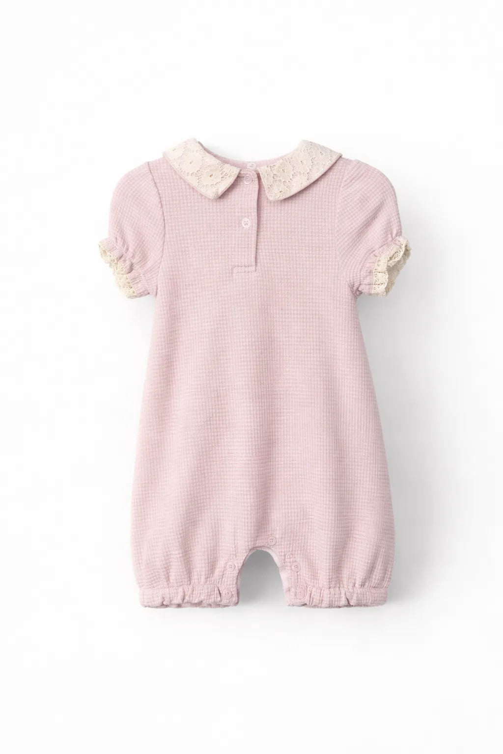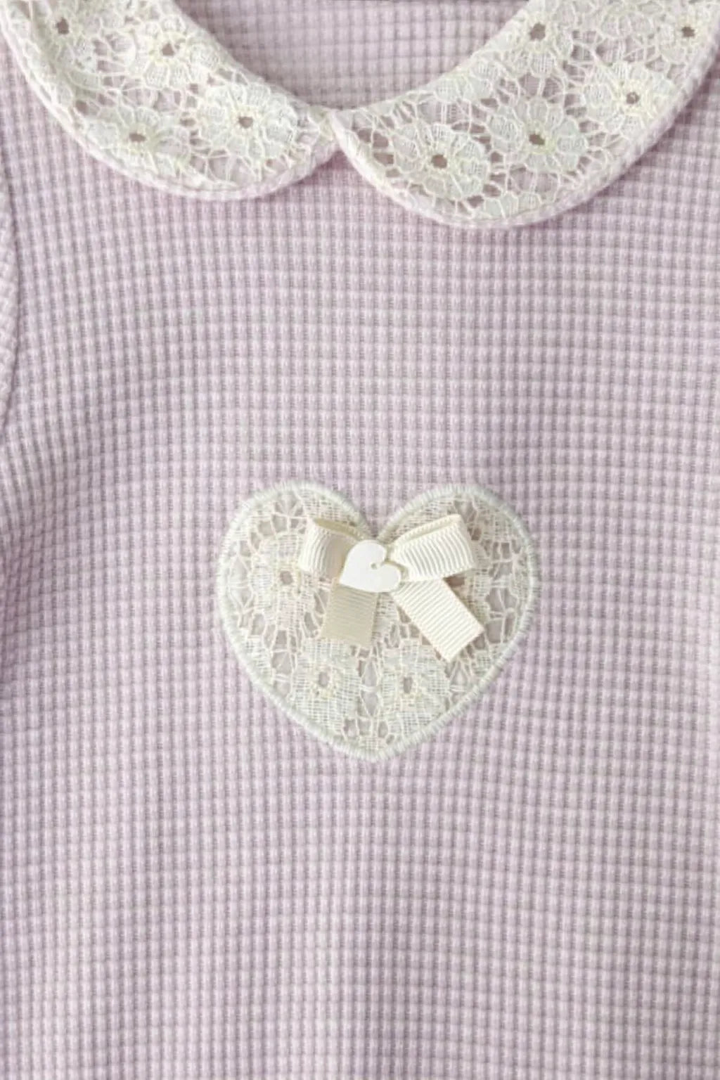 A charming cotton, baby girl overall designed with a lace trimmed collar and a delicate heart detail on the front.