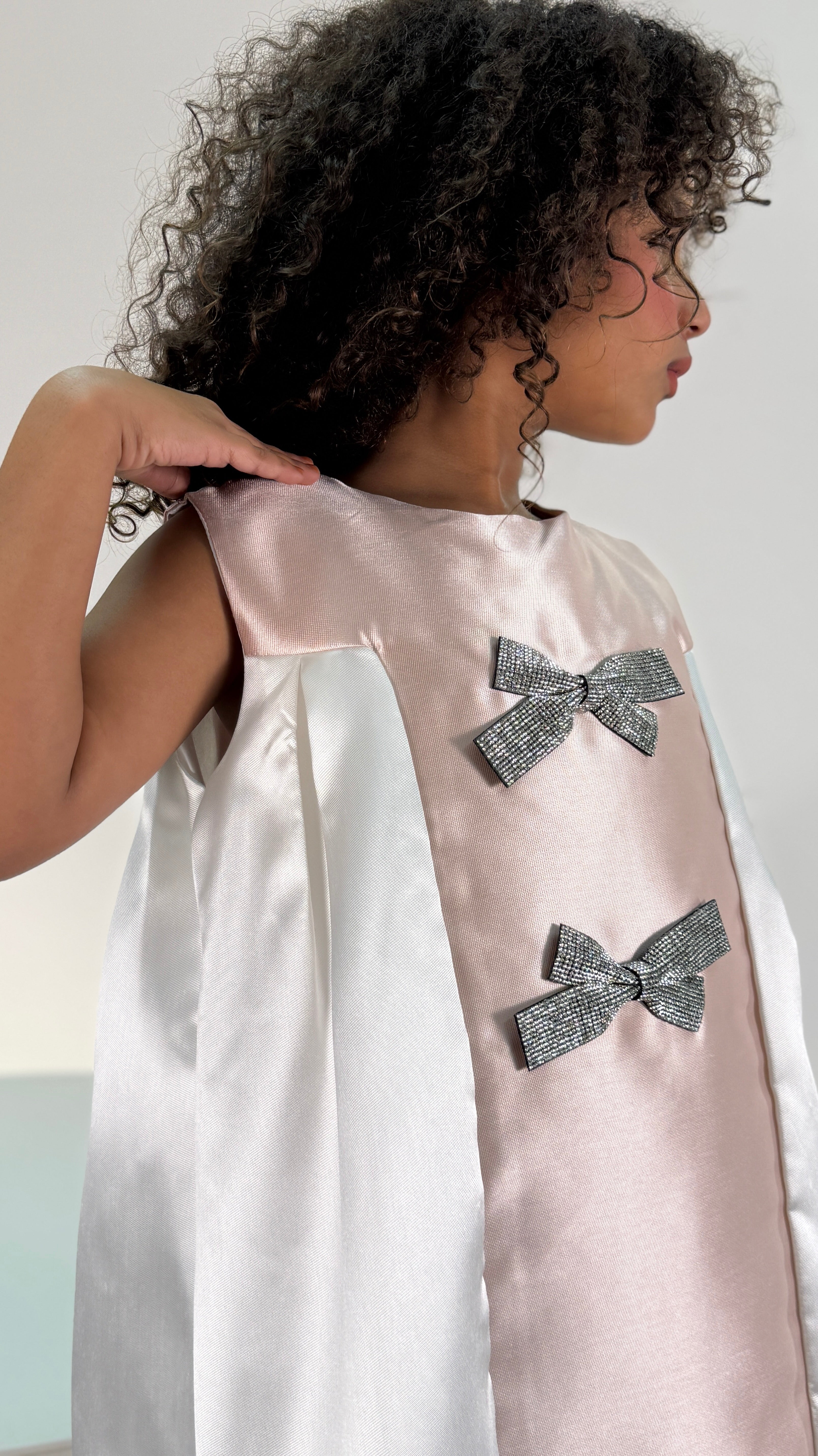 Soft pearled white and pink tones, comes with a glitter bow at the center. Perfect for special occasions. The generous, flowing cut offers comfort and movement for active kids.