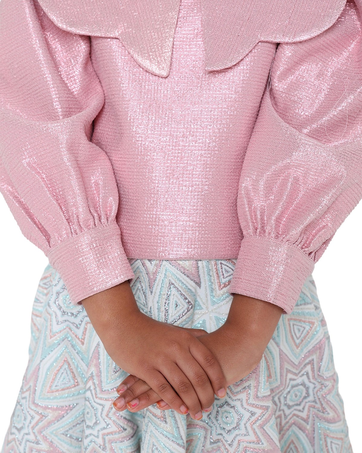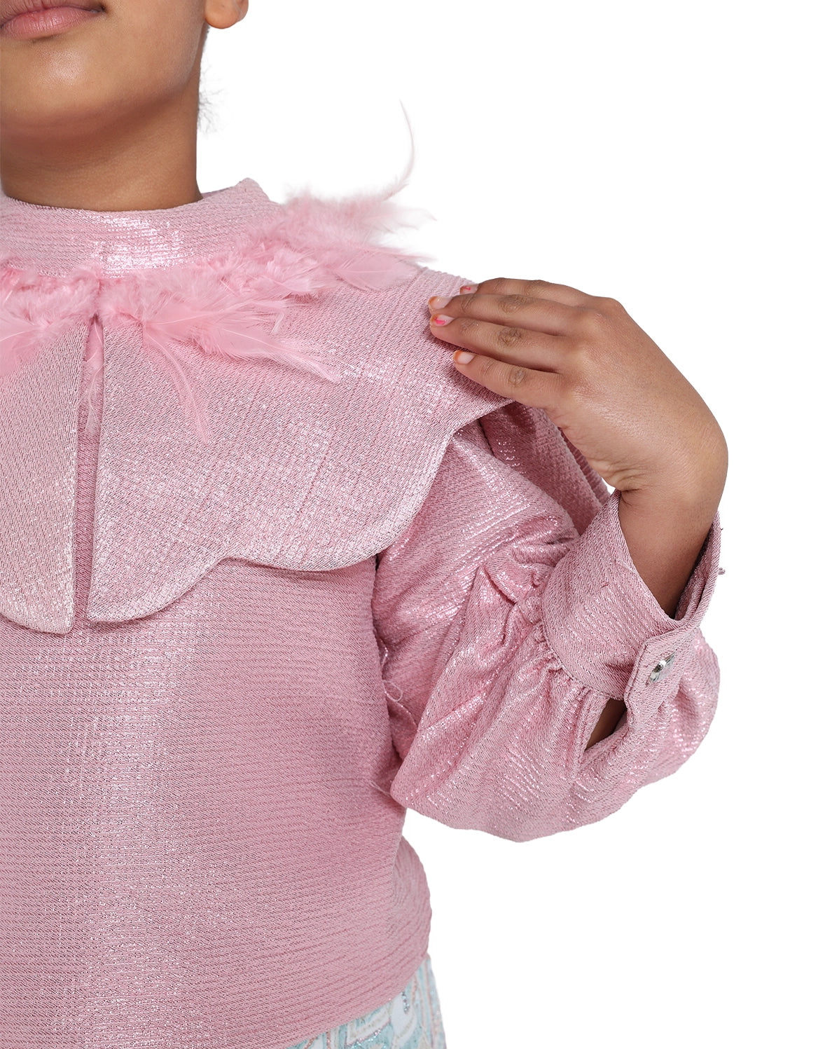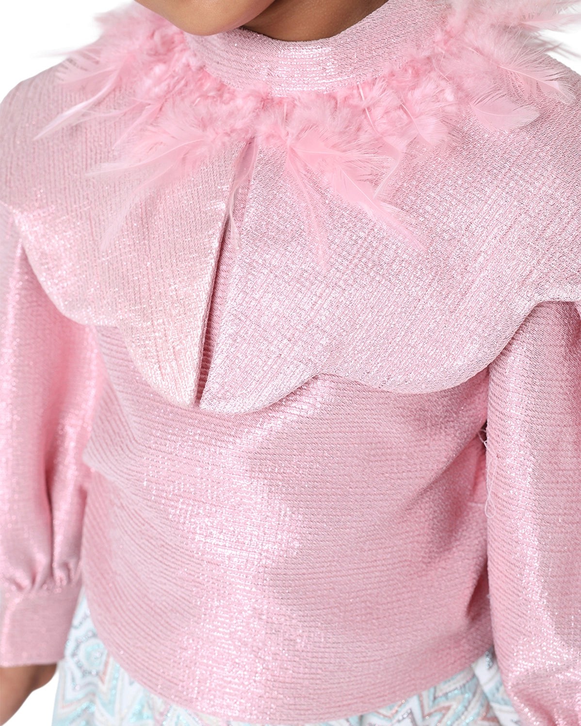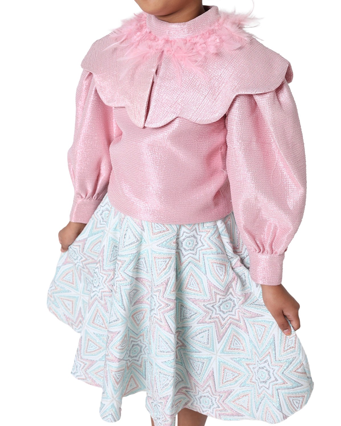 Blush feathers accent a graceful skirt silhouette. Light, playful, refined.