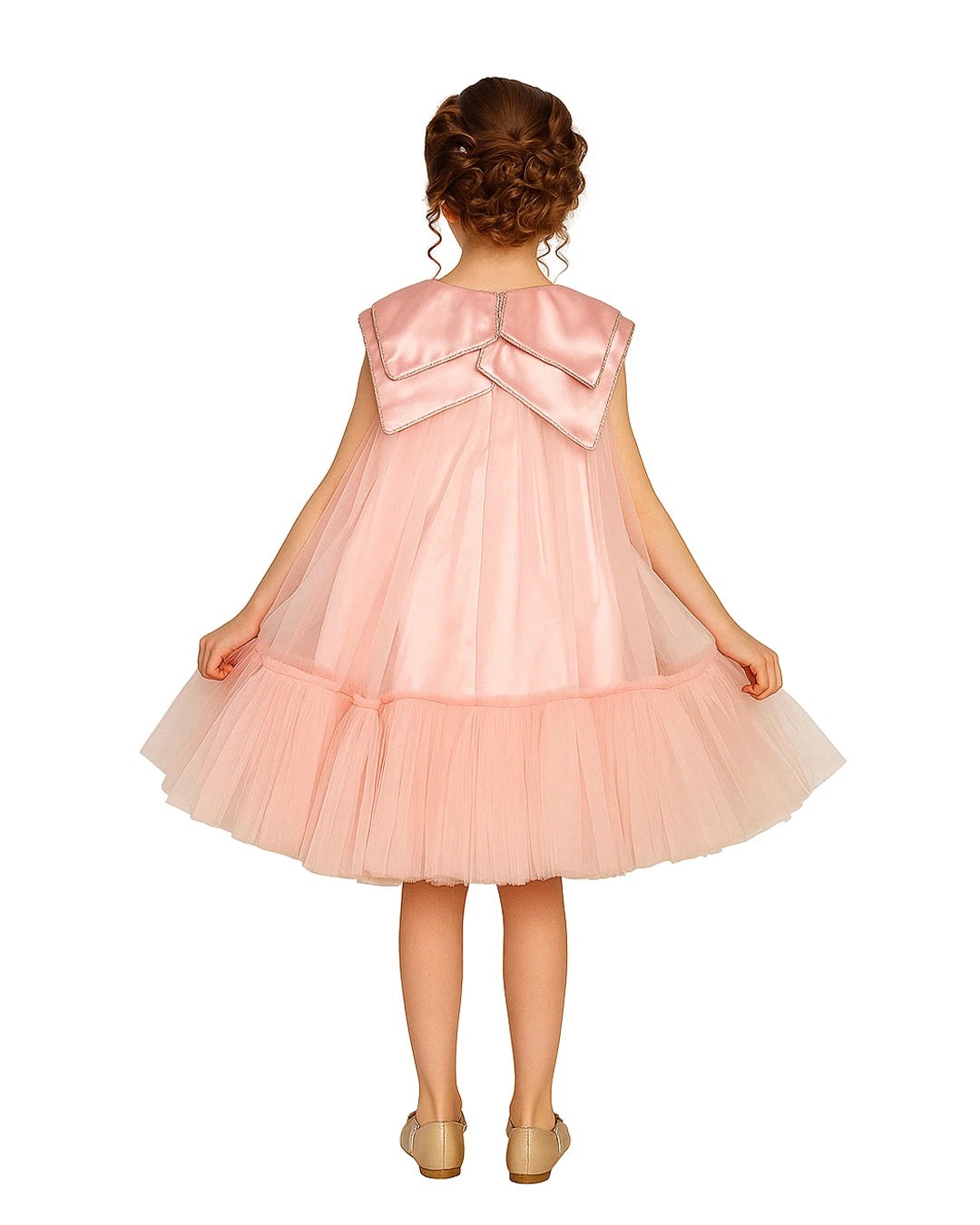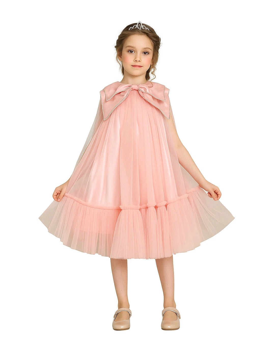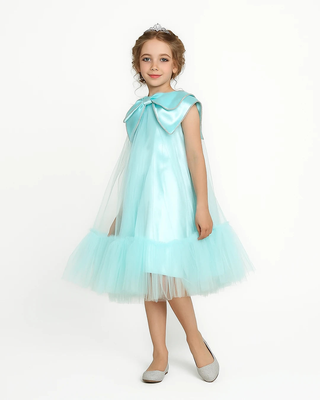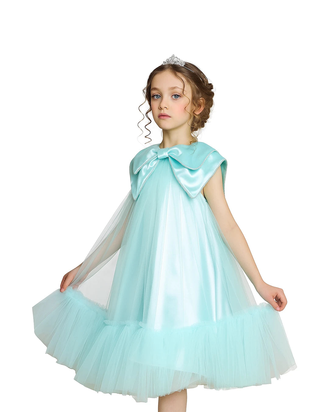 A beautiful flowy dress with a big shiny bow and soft tulle layers. Comes with a matching headband for the perfect princess look. Available in pink, blue, and ivory.