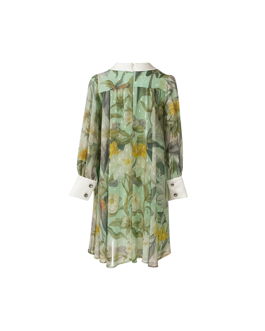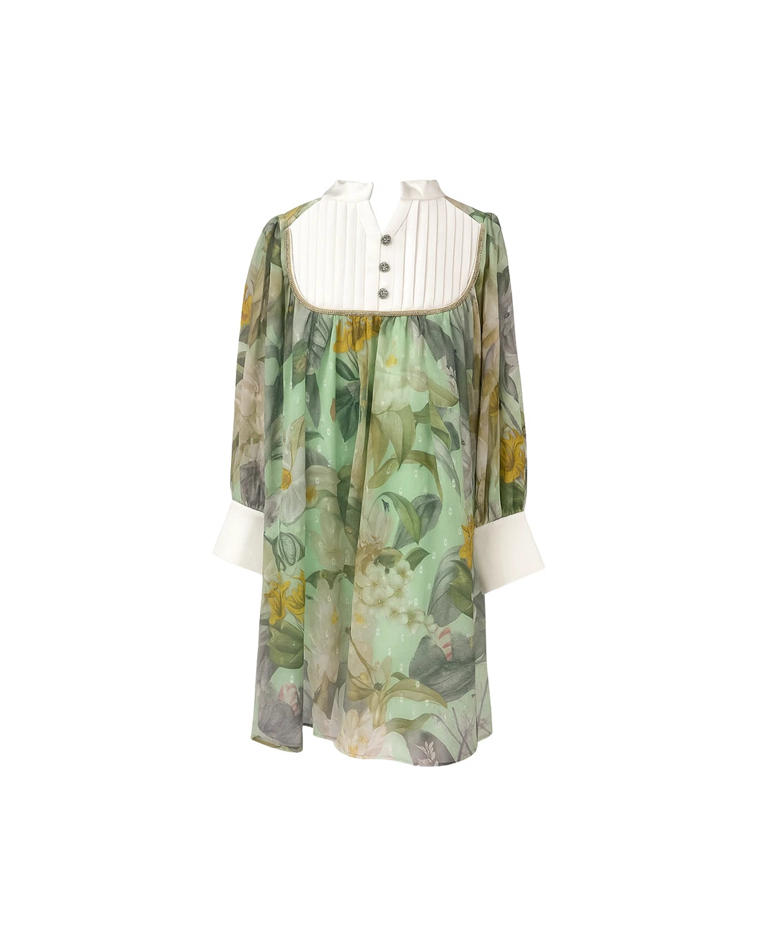 Floral Dress layered with chiffon fabric and crystal buttons.